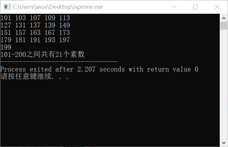//编程输出101-200之间所有素数,并输出这一区间内素数个数。 #include <stdio.h> #include <math.h> int isprime(int n); int main(){ int n,a=0,b; for(n=101;n<200;n++){ if (isprime(n)){ printf ("%d ",n); a=a+1; b=b+1; if(b%5==0) //一行5个 printf("\n"); } } printf("\n101-200之间共有%d个素数",a); return 0; } int isprime (int n){ int k; for(k=2;k<=sqrt(n);k++) if(n%k==0) return 0; return 1; }