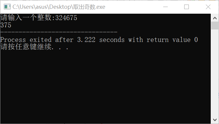 #include<stdio.h> #include <stdlib.h> int main(){ int a,b,c,t=0,p=1; printf("请输入一个整数:\n"); while(scanf("%d",&a)){ t=0; p=1; for(b=10;a>0;a=a/10){ //取出各个数 c=a%b; if(c%2){ //判断是否奇数 t=t+c*p; //正序 p=p*10; } } printf("%d\n",t); printf("请输入一个整数:\n"); } system("pause"); return 0; }