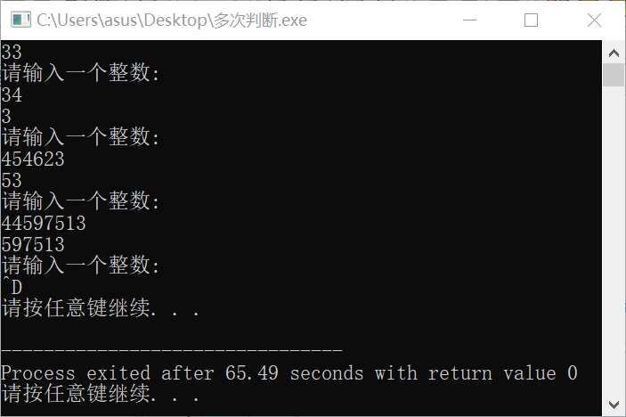 拓展(*选做*):参考「Part1: 验证性内容」中的一元二次方程求解练习,修改上述程序,使得它可以实现多组判断,直到用户按下Ctrl+D或Ctrl+E结束。