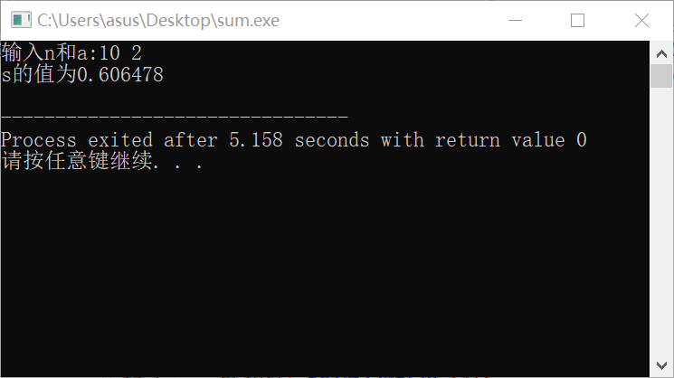 //编写程序,实现从键盘上输入n和a,根据公式s=1/a+2/aa+3/aaa+…+n/(a..a)计算s的值,并输出。 #include <stdio.h> int main (){ double a,s,t,m=0; int b,n; printf("输入n和a:"); scanf("%d%lf",&n,&a); for(b=1,s=0;b<=n;b=b+1){ m=a+m*10; //分母 t=b/m; //每项值 s=s+t; //和 } printf("s的值为%lf\n",s); return 0; }