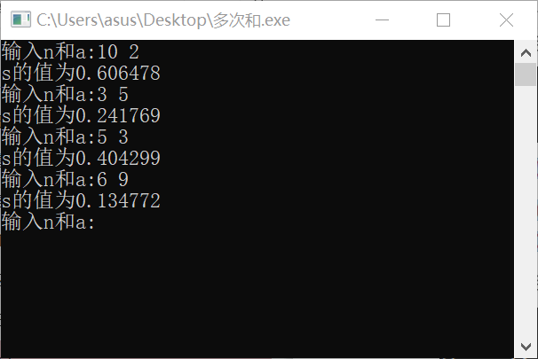 //编写程序,实现从键盘上输入n和a,根据公式s=1/a+2/aa+3/aaa+…+n/(a..a)计算s的值,并输出。 #include <stdio.h> int main (){ double a,s,t,m=0; int b,n; printf("输入n和a:"); while(scanf("%d%lf",&n,&a)!=EOF){ m=0; for(b=1,s=0;b<=n;b=b+1){ m=a+m*10; //分母 t=b/m; //每项值 s=s+t; //和 } printf("s的值为%lf\n",s); printf("输入n和a:"); } return 0; }