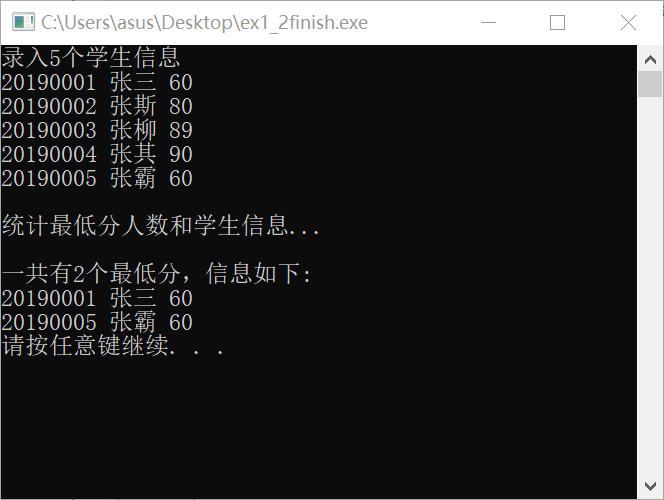 #include <stdio.h> #include <stdlib.h> const int N=5; // 定义结构体类型struct student,并定义STU为其别名 typedef struct student { long no; char name[20]; int score; }STU; // 函数声明 void input(STU s[], int n); int findMinlist(STU s[], STU t[], int n); void output(STU s[], int n); int main() { STU stu[N], minlist[N]; int count; printf("录入%d个学生信息\n", N); input(stu, N); printf("\n统计最低分人数和学生信息...\n"); count = findMinlist(stu, minlist, N); printf("\n一共有%d个最低分,信息如下:\n", count); output(minlist, count); system("pause"); return 0; } // 输入n个学生信息,存放在结构体数组s中 void input(STU s[], int n) { int i; for(i=0; i<n; i++) scanf("%ld %s %d", &s[i].no, s[i].name, &s[i].score); } // 输出结构体s中n个元素信息 void output(STU s[], int n) { int i; for(i=0; i<n; i++) printf("%ld %s %d\n", s[i].no, s[i].name, s[i].score); } // 在结构体数组s中,查找最低分学生的记录,将其存入结构体数组s中 // 形参n是结构体数组s中元素个数 // 函数返回最低分的学生人数 int findMinlist(STU s[], STU t[], int n) { // 补足函数实现 // ××× int i=0,k=0,a=s[0].score; for(i=0;i<n;i++) if(s[i].score<a) a=s[i].score; for(i=0;i<n;i++){ if( s[i].score==a){ t[k]=s[i]; k++; } } return k; }