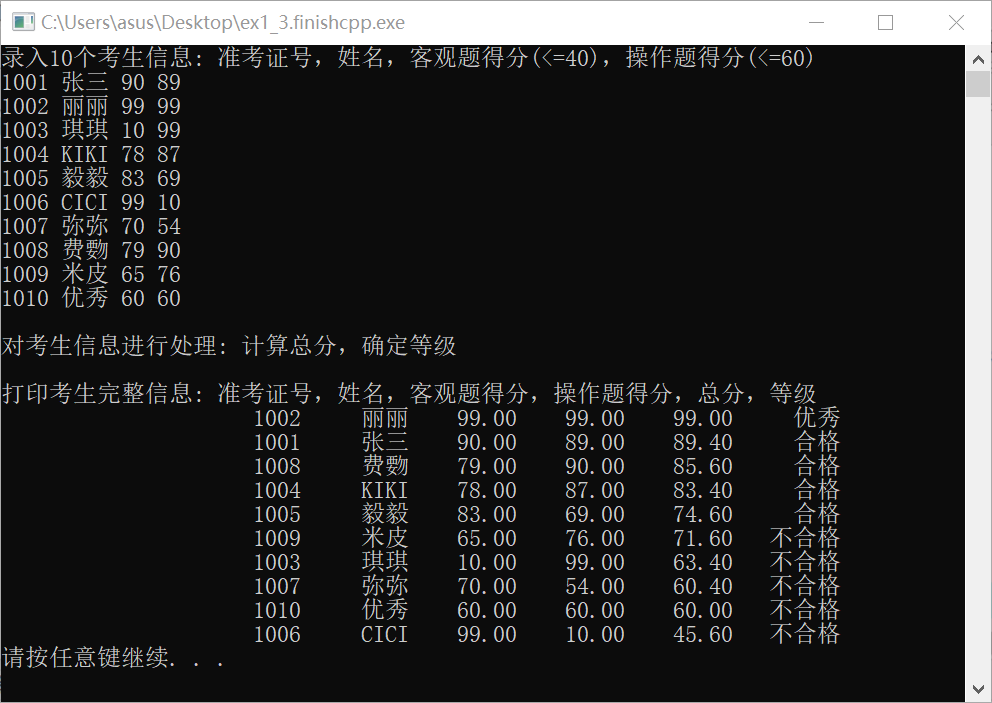 #include <stdio.h> #include <stdlib.h> #include <string.h> const int N = 10; // 定义结构体类型struct student,并定义其别名为STU typedef struct student { long int id; char name[20]; float objective; /*客观题得分*/ float subjective; /*操作题得分*/ float sum; char level[10]; }STU; // 函数声明 void input(STU s[], int n); void output(STU s[], int n); void process(STU s[], int n); int main() { STU stu[N]; printf("录入%d个考生信息: 准考证号,姓名,客观题得分(<=40),操作题得分(<=60)\n", N); input(stu, N); printf("\n对考生信息进行处理: 计算总分,确定等级\n"); process(stu, N); printf("\n打印考生完整信息: 准考证号,姓名,客观题得分,操作题得分,总分,等级\n"); output(stu, N); system("pause"); return 0; } // 录入考生信息:准考证号,姓名,客观题得分,操作题得分 void input(STU s[], int n) { // 补足代码 // ××× int i; for(i=0;i<n;i++) scanf("%ld %s %f %f",&s[i].id,s[i].name,&s[i].objective,&s[i].subjective); } //输出考生完整信息: 准考证号,姓名,客观题得分,操作题得分,总分,等级 void output(STU s[], int n) { // 补足代码 // ××× int i; for(i=0;i<n;i++) printf("%25d %8s %8.2f %8.2f %8.2f %8s\n",s[i].id,s[i].name,s[i].objective,s[i].subjective,s[i].sum,s[i].level); } // 对考生信息进行处理:计算总分,排序,确定等级 void process(STU s[], int n) { // 补足代码 // ××× int i,j; STU temp; for(i=0;i<n;i++) s[i].sum=s[i].objective*0.4+s[i].subjective*0.6; for(i=0;i<n-1;i++) for(j=0;j<n-1;j++) if(s[j].sum<s[j+1].sum){ temp=s[j]; s[j]=s[j+1]; s[j+1]=temp; } for(i=0;i<=n*0.1;i++) strcpy(s[0].level,"优秀"); for(i=n*0.1;i<=n*0.5;i++) strcpy(s[i].level,"合格"); for(i=n*0.5;i<n;i++) strcpy(s[i].level,"不合格"); }