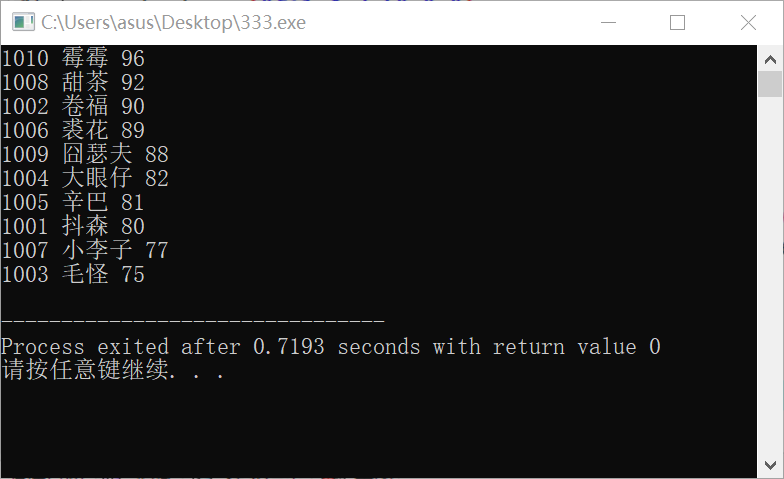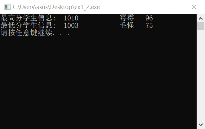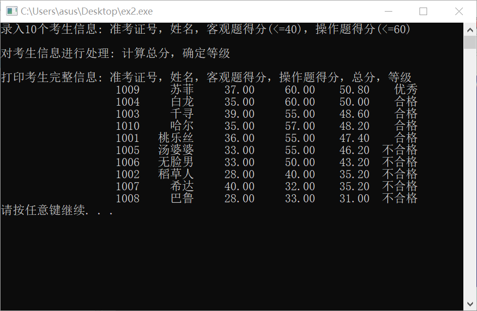 #include <stdio.h> #include <stdlib.h> #include <string.h> const int N = 10; // 定义结构体类型struct student,并定义其别名为STU typedef struct student { long int id; char name[20]; float objective; /*客观题得分*/ float subjective; /*操作题得分*/ float sum; char level[10]; }STU; // 函数声明 void input(STU s[], int n); void output(STU s[], int n); void process(STU s[], int n); int main() { STU stu[N]; printf("录入%d个考生信息: 准考证号,姓名,客观题得分(<=40),操作题得分(<=60)\n", N); input(stu, N); printf("\n对考生信息进行处理: 计算总分,确定等级\n"); process(stu, N); printf("\n打印考生完整信息: 准考证号,姓名,客观题得分,操作题得分,总分,等级\n"); output(stu, N); system("pause"); return 0; } // 从文本文件examinee.txt读入考生信息:准考证号,姓名,客观题得分,操作题得分 void input(STU s[], int n) { // 补足代码 // ××× FILE *fp; int i; if((fp=fopen("examinee.txt","r"))==NULL) { printf("cannot open file"); exit(0); } for(i=0;i<n;i++){ if(fscanf(fp,"%ld %s %f %f",&s[i].id,s[i].name,&s[i].objective,&s[i].subjective)==0) printf("error!"); } fclose(fp); } // 输出考生完整信息: 准考证号,姓名,客观题得分,操作题得分,总分,等级 // 不仅输出到屏幕上,还写到文本文件result.txt中 void output(STU s[], int n) { // 补足代码 // ××× FILE *fp; int i; if((fp=fopen("result.txt","w"))==NULL) { printf("cannot open file"); exit(0); } for(i=0;i<n;i++) { printf("%23d %8s %9.2f %9.2f %8.2f %7s\n",s[i].id,s[i].name,s[i].objective,s[i].subjective,s[i].sum,s[i].level); fprintf(fp,"%23d %8s %9.2f %9.2f %8.2f %7s\n",s[i].id,s[i].name,s[i].objective,s[i].subjective,s[i].sum,s[i].level); } fclose(fp); } // 对考生信息进行处理:计算总分,排序,确定等级 void process(STU s[], int n) { // 补足代码 // ××× int i,j; STU temp; for(i=0;i<n;i++) s[i].sum=s[i].objective*0.4+s[i].subjective*0.6; for(i=0;i<n-1;i++) for(j=0;j<n-1;j++) if(s[j].sum<s[j+1].sum){ temp=s[j]; s[j]=s[j+1]; s[j+1]=temp; } for(i=0;i<=n*0.1;i++) strcpy(s[0].level,"优秀"); for(i=n*0.1;i<=n*0.5;i++) strcpy(s[i].level,"合格"); for(i=n*0.5;i<n;i++) strcpy(s[i].level,"不合格"); }