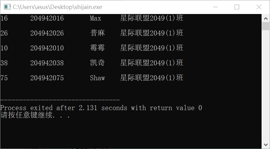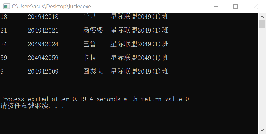 #include <stdio.h> #include <stdlib.h> #include <time.h> #define N 80 int main(){ FILE *fp,*fout; int i,lucky[5],j; char stuinfo[N][80]; fp=fopen("list.txt","r"); if(fp==NULL){ printf("fail to open file"); exit(0); }; fout=fopen("lucky.txt","w"); if(fout==NULL){ printf("fail to open file"); exit(0); }; for(i=0;i<N;i++) fgets(stuinfo[i],80,fp);//读取 srand(time(NULL));//随机种子 for(i=0;i<5;i++){ lucky[i]=rand()%N;//随机数 for(j=0;j<i;j++){ if(lucky[j]==lucky[i])//避免重复 lucky[i]=rand()%N; } puts(stuinfo[lucky[i]]); fputs(stuinfo[lucky[i]],fout); } fclose(fp); fclose(fout); return 0; }