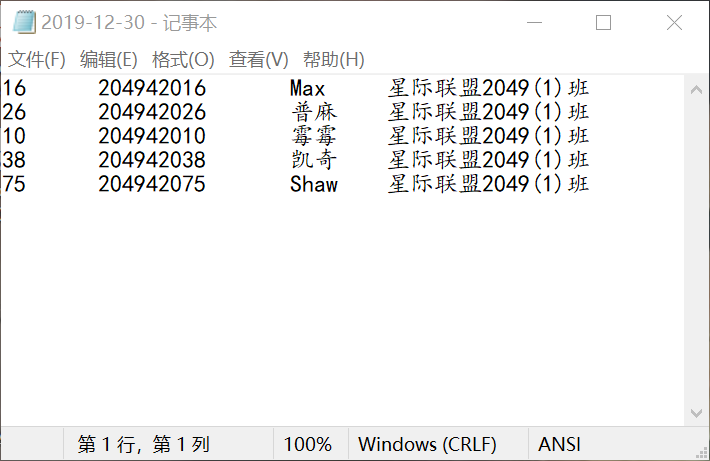 #include <stdio.h> #include <stdlib.h> #include <time.h> #define N 80 int main(){ FILE *fp,*fout; int i,lucky[5],j; char stuinfo[N][80]; time_t rawtime; struct tm *info; char buffer[80]={0}; rawtime=time(0); info = localtime( &rawtime ); strftime(buffer, 80, "%Y-%m-%d.txt", info); fp=fopen("list.txt","r"); if(fp==NULL){ printf("fail to open file"); exit(0); }; fout=fopen(buffer,"w"); if(fout==NULL){ printf("fail to open file "); exit(0); }; for(i=0;i<N;i++) fgets(stuinfo[i],80,fp);//读取 srand(time(NULL));//随机种子 for(i=0;i<5;i++){ lucky[i]=rand()%N;//随机数 for(j=0;j<i;j++){ if(lucky[j]==lucky[i])//避免重复 lucky[i]=rand()%N; } puts(stuinfo[lucky[i]]); fputs(stuinfo[lucky[i]],fout); } fclose(fp); fclose(fout); return 0; }