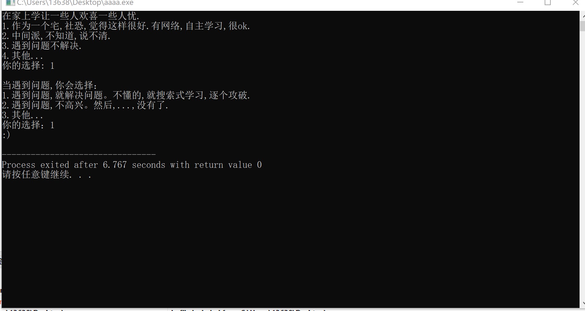 printf("1.作为一个宅,社恐,觉得这样很好.有网络,自主学习,很ok.\n");