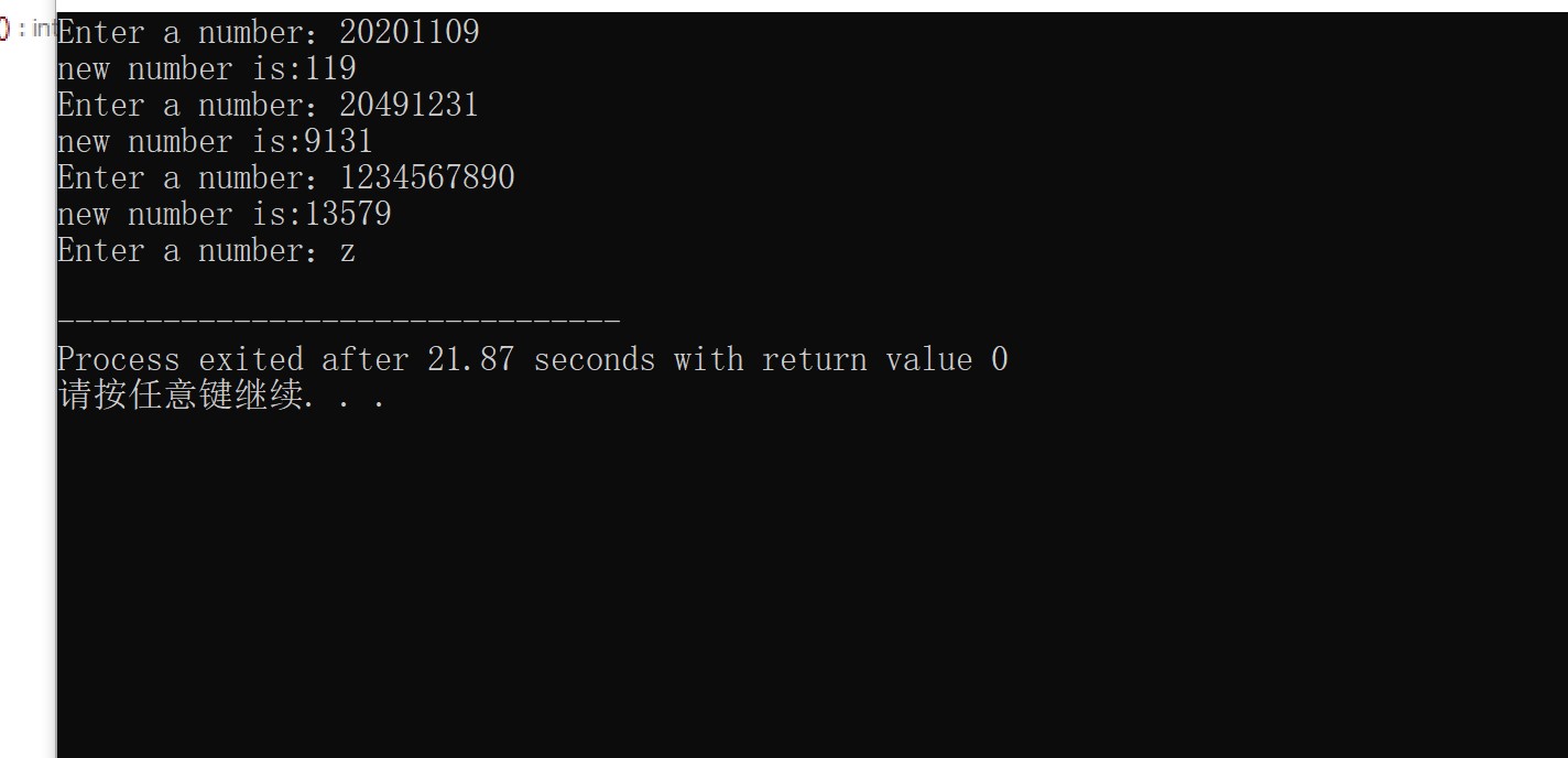 #include<stdio.h> #include<math.h> int main() { int n,a,b,i,s; printf("Enter a number:"); scanf("%d",&n); while(n){ i=0; s=0; while(n!=0){ a=n%10; b=a%2; if(b!=0){ s=s+a*pow(10,i); i++;} n/=10;} printf("new number is:%d\n",s); printf("Enter a number:"); scanf("%d",&n);} return 0;}
