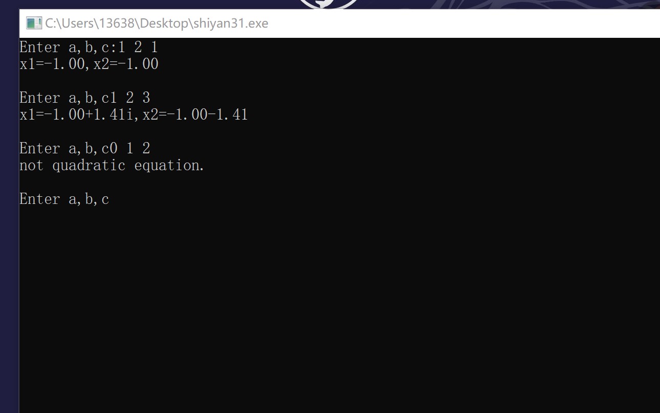 #include<stdio.h> #include<math.h> int main(){ float a,b,c,x1,x2; float delta,real,imag; printf("Enter a,b,c:"); while(scanf("%f%f%f",&a,&b,&c)!=EOF){ if(a==0) printf("not quadratic equation.\n\n"); else{ delta =b*b-4*a*c; if(delta >=0){ x1 =(-b+sqrt(delta))/(2*a); x2 =(-b+sqrt(delta))/(2*a); printf("x1=%.2f,x2=%.2f\n\n",x1,x2); } else{ real=-b/(2*a); imag=sqrt(-delta)/(2*a); printf("x1=%.2f+%.2fi,x2=%.2f-%.2f\n\n",real,imag,real,imag); } } printf("Enter a,b,c"); } return 0; }