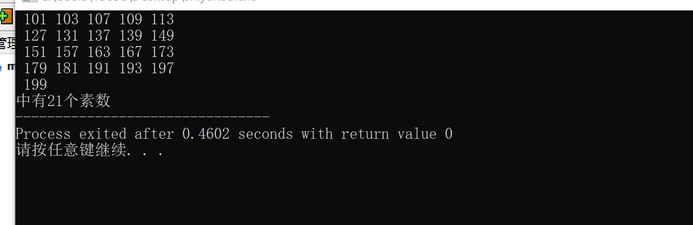#include<stdio.h> #include<math.h> int main(){ int i,j; int count=0; for(i=100;i<=200;i++) { for(j=2;j<=sqrt(i);j++) if(i%j==0) break; if(j>sqrt(i)) { printf("%4d",i); count++; if(count%5==0) printf("\n"); } }printf("\n101~200中有%d个素数",count); return 0; }