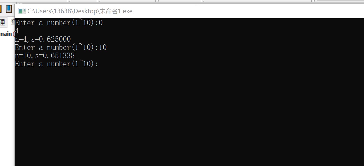 int main(){ int n,m,i; double x,s; s=0; x=1; m=-1; printf("Enter a number(1~10):%d\n",n); while(scanf("%d",&n)!=EOF) { for(i=1;i<=n;i++) { m=-m; x=x*i; s=s+m*(1/x); } printf("n=%d,s=%lf\n",n,s); printf("Enter a number(1~10):"); } return 0; }