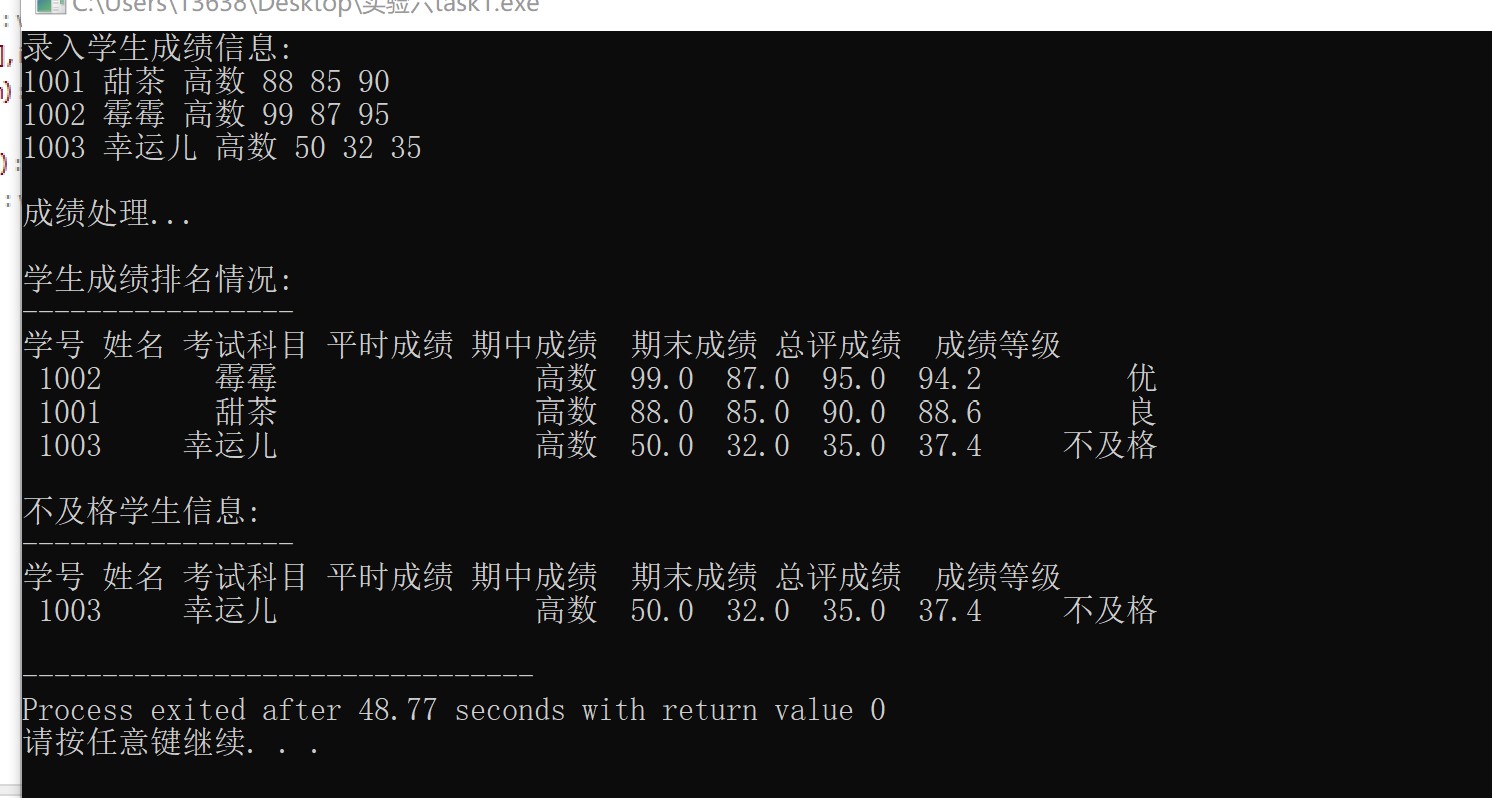 // P280例8.15 // 对教材上的程序作了微调整,把输出学生信息单独编写成一个函数模块 // 打印不及格学生信息和所有学生信息程分别调用 #include<stdio.h> #include<stdlib.h> #include<string.h> #define N 3 // 运行程序输入测试时,可以把N改小一些输入测试 typedef struct student { int id; /*学生学号 */ char name[20]; /*学生姓名 */ char subject[20]; /*考试科目 */ float perf; /*平时成绩 */ float mid; /* 期中成绩 */ float final; /* 期末成绩 */ float total; /* 总评成绩 */ char level[10]; /* 成绩等级 */ } STU; void input(STU[],int ); /*输入学生信息 */ void calc(STU[],int); /*计算总评和等级 */ int fail(STU[],STU [],int); /*不及格学生统计 */ void sort(STU[],int); /*排序 */ void print(STU[], int); /*输出学生信息*/ int main() { STU st[N],fst[N]; // 数组st记录学生信息,fst记录不及格学生信息 int k; // 用于记录不及格学生个数 printf("录入学生成绩信息:\n"); input(st,N); printf("\n成绩处理...\n"); calc(st,N); k = fail(st,fst,N); sort(st, N); printf("\n学生成绩排名情况:\n"); print(st, N); printf("\n不及格学生信息:\n"); print(fst, k); return 0;} // 输入学生信息 void input(STU s[],int n) { int i; for(i=0;i<n;i++) scanf("%d %s %s %f %f %f",&s[i].id,s[i].name,s[i].subject,&s[i].perf,&s[i].mid,&s[i].final);} // 计算总评和等级 void calc(STU s[],int n) { int i; for(i=0;i<n;i++) { s[i].total=s[i].perf*0.2+s[i].mid*0.2+s[i].final*0.6; if(s[i].total>=90) strcpy(s[i].level,"优"); // 注意:等级是字符型数组,要使用strcpy完成赋值 else if(s[i].total>=80 && s[i].total<90) strcpy(s[i].level,"良"); else if(s[i].total>=70 && s[i].total<80) strcpy(s[i].level,"中"); else if(s[i].total>=60 && s[i].total<70) strcpy(s[i].level,"及格"); else strcpy(s[i].level,"不及格"); } } // 不及格学生统计 // 数组s存放的是所有学生信息,数组t存放不及格学生信息,n是数组s中元素个数 // 函数返回值:返回的是不及格人数 int fail(STU s[],STU t[],int n) { int i,k=0; for(i=0;i<n;i++) if(s[i].total<60) t[k++]=s[i]; return k;} // 根据总评成绩对学生记录信息排序 // 使用的是冒泡排序算法 void sort(STU s[],int n) { int i,j; STU temp; for(i=0;i<n-1;i++) for(j=0;j<n-1-i;j++) if(s[j].total<s[j+1].total) { temp = s[j]; s[j] = s[j+1]; s[j+1] = temp; } } // 输出学生信息 void print(STU s[], int n) { int i; printf("-----------------\n"); printf("学号 姓名 考试科目 平时成绩 期中成绩 期末成绩 总评成绩 成绩等级\n"); for(i=0;i<n;i++) printf("%5d %10s%20s %5.1f %5.1f %5.1f %5.1f %10s\n",s[i].id,s[i].name,s[i].subject,s[i].perf,s[i].mid,s[i].final,s[i].total,s[i].level); }