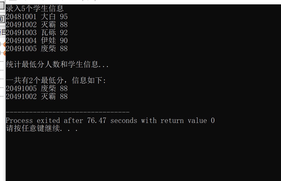 #include <stdio.h> const int N=5; // 定义结构体类型struct student,并定义STU为其别名 typedef struct student { long no; char name[20]; int score; }STU; // 函数声明 void input(STU s[], int n); int findMinlist(STU s[], STU t[], int n); void output(STU s[], int n); int main() { STU stu[N], minlist[N]; int count; printf("录入%d个学生信息\n", N); input(stu, N); printf("\n统计最低分人数和学生信息...\n"); count = findMinlist(stu, minlist, N); printf("\n一共有%d个最低分,信息如下:\n", count); output(minlist, count); return 0; } // 输入n个学生信息,存放在结构体数组s中 void input(STU s[], int n) { int i; for(i=0; i<n; i++) scanf("%ld %s %d", &s[i].no, s[i].name, &s[i].score);} // 输出结构体s中n个元素信息 void output(STU s[], int n) { int i; for(i=0; i<n; i++) printf("%ld %s %d\n", s[i].no, s[i].name, s[i].score); } // 在结构体数组s中,查找最低分学生的记录,将其存入结构体数组t中 // 形参n是结构体数组s中元素个数 // 函数返回最低分的学生人数 int findMinlist(STU s[], STU t[], int n) { int i,j=0; for(i=0;i<n-1;i++) { if(s[i].score>s[i+1].score) t[j]=s[i+1]; } for(i=0;i<n;i++) if(t[j].score==s[i].score) t[++j]=s[i]; return j; }
