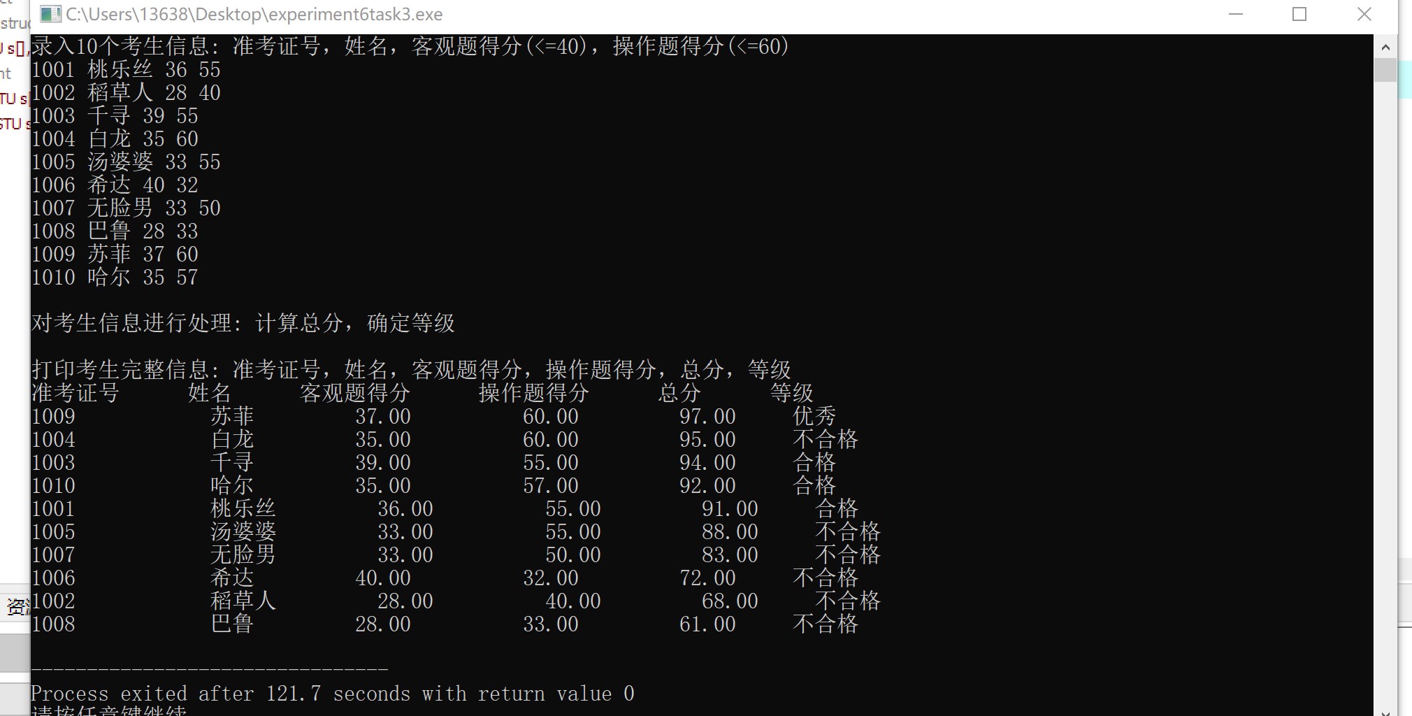 #include <stdio.h> #include <string.h> const int N = 10; // 定义结构体类型struct student,并定义其别名为STU typedef struct student { long int id; char name[20]; float objective; /*客观题得分*/ float subjective; /*操作题得分*/ float sum; char level[10]; }STU; // 函数声明 void input(STU s[], int n); void output(STU s[], int n); void process(STU s[], int n); int main() { STU stu[N]; printf("录入%d个考生信息: 准考证号,姓名,客观题得分(<=40),操作题得分(<=60)\n", N); input(stu, N); printf("\n对考生信息进行处理: 计算总分,确定等级\n"); process(stu, N); printf("\n打印考生完整信息: 准考证号,姓名,客观题得分,操作题得分,总分,等级\n"); output(stu, N); return 0;} // 录入考生信息:准考证号,姓名,客观题得分,操作题得分 void input(STU s[], int n) { int i; for(i=0;i<n;i++) scanf("%ld %s %f %f",&s[i].id,s[i].name,&s[i].objective,&s[i].subjective); } //输出考生完整信息: 准考证号,姓名,客观题得分,操作题得分,总分,等级 void output(STU s[], int n) { int i; printf("准考证号 姓名 客观题得分 操作题得分 总分 等级\n"); for(i=0;i<n;i++) printf("%ld %s %.2f %.2f %.2f %s\n",s[i].id,s[i].name,s[i].objective,s[i].subjective,s[i].sum,s[i].level); } // 对考生信息进行处理:计算总分,排序,确定等级 void process(STU s[], int n) { int i,j; STU temp; for(i=0;i<n;i++) s[i].sum=s[i].objective+s[i].subjective; for(i=0;i<n-1;i++) { for(j=0;j<n-i-1;j++){ if(s[j].sum<s[j+1].sum) { temp=s[j]; s[j]=s[j+1]; s[j+1]=temp; } } } for(i=0;i<n;i++){ if(i<0.1*n) strcpy(s[i].level,"优秀"); else if(i<0.5*n&&i>0.1*n) strcpy(s[i].level,"合格"); else strcpy(s[i].level,"不合格"); } }