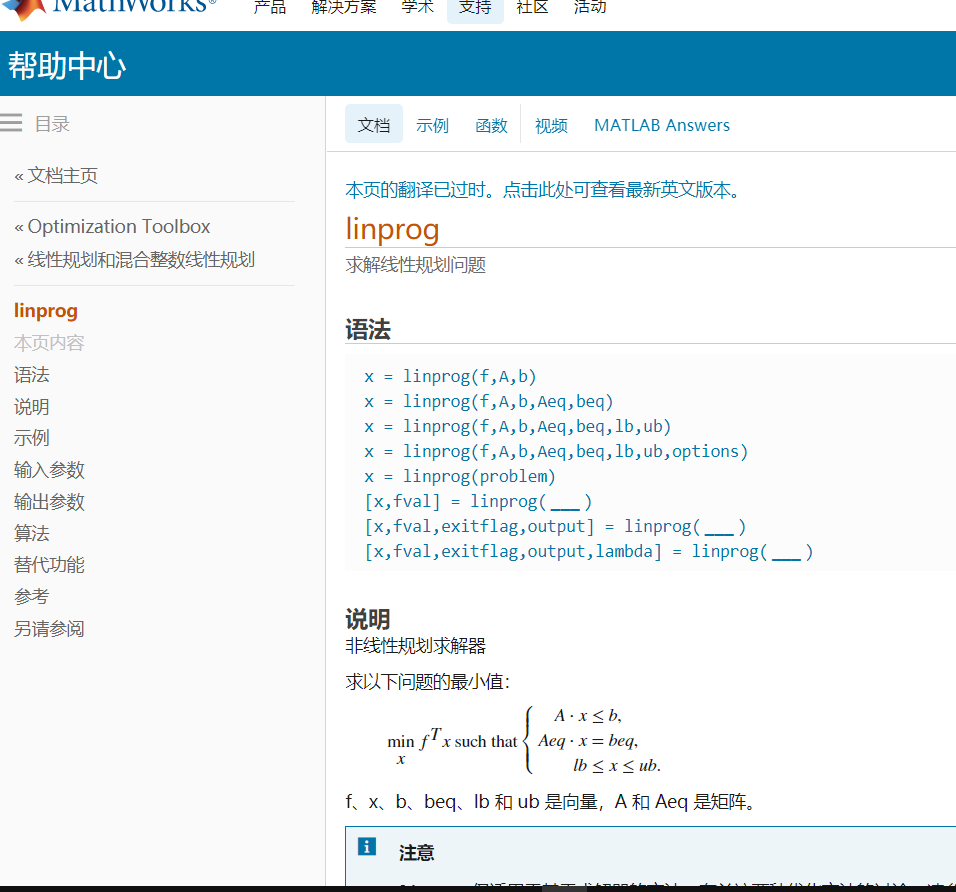 第二种方法,例如,我们要查找linprog的用法,我们只需要输入在下方命令行输入doc linprog就会弹出相关教程。不过我的弹出来的是英文的,英语好的可以忽略。但是,如果英语不好的,可以直接百度“linprog mathworks中国”,就会弹出中文教程