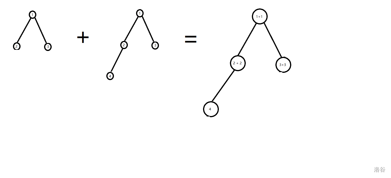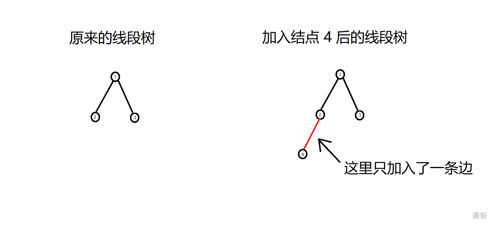 - 如果两颗线段树中只有一棵线段树有一个结点,而另一个线段树没有,那么就将新的线段树连向这个结点