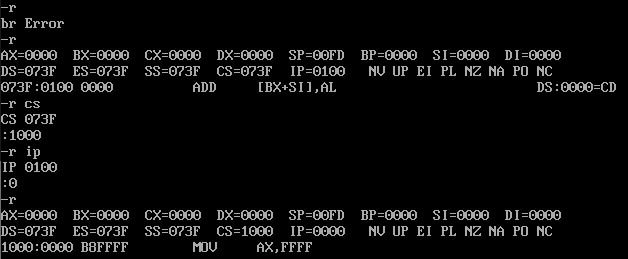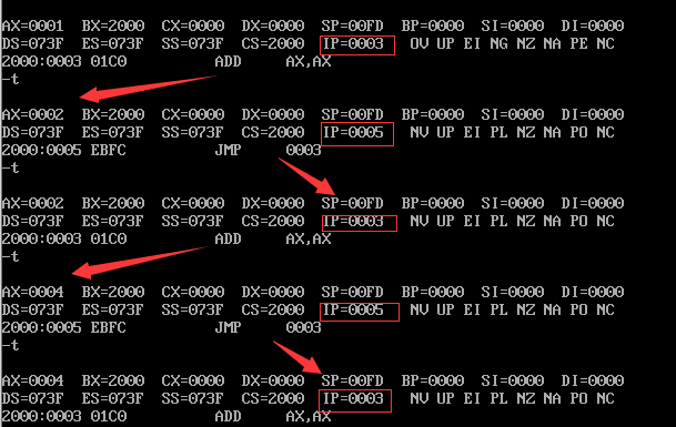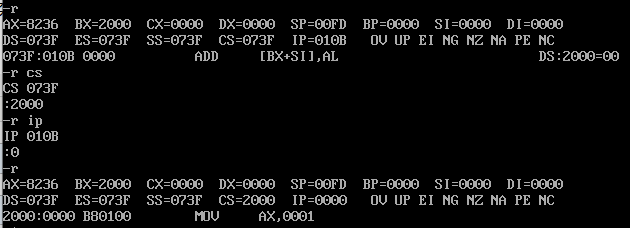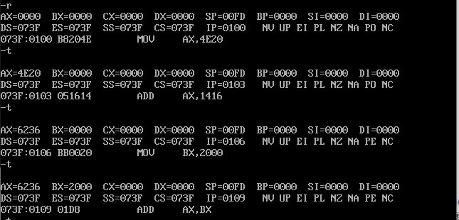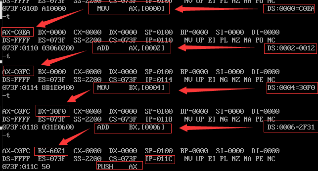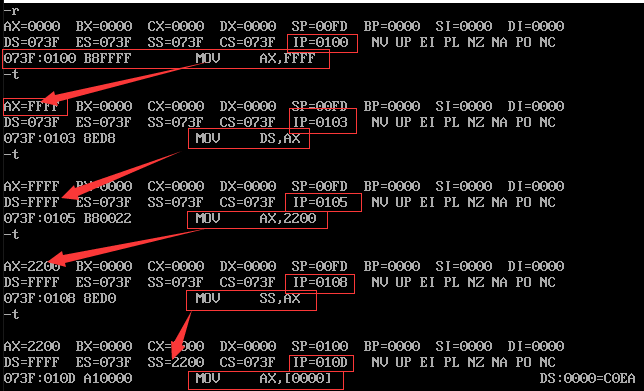 (3)使用t命令分布执行指令,确保cs存储的就是我们期望的代码段的段地址,ip存储的也是我们期望的开始偏移地址