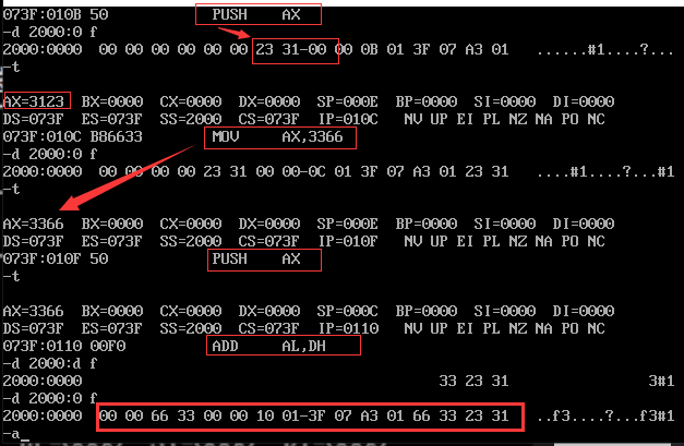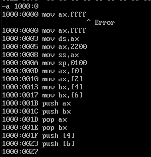(2)通过对栈数据的观察,我们发现栈还暂存了ax寄存器的数据。通过了解,知道了dos下系统只有一个栈,也就是说,外部操作未设置栈时,系统自己已经有一个栈在做暂存等相关工作了,当外部进行设置时,暂存等工作就发生在新栈中,因此没有进行push前系统已经先用来暂存相关数据了,这就是我们看到数据的原因。