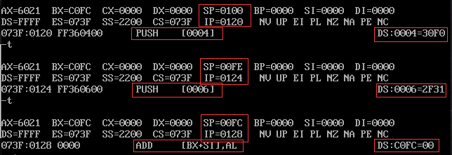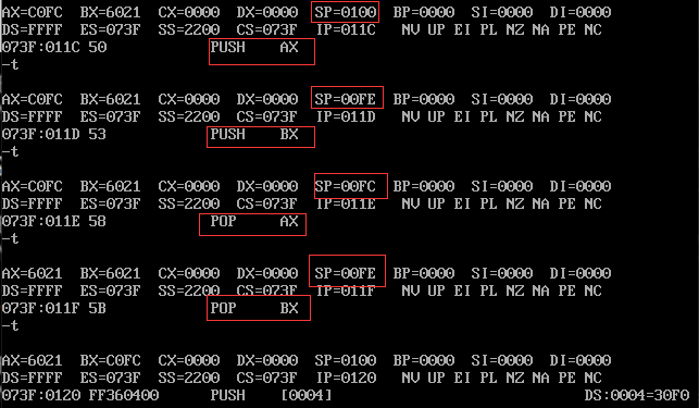(2)DOS下栈只有一个,它不仅可以push和pop,还可以在执行指令时进行相关寄存器数据暂存。