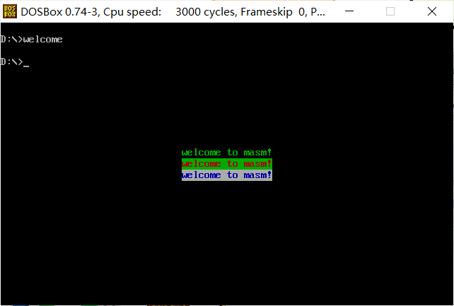 assume cs:code, ds:data data segment db 'welcome to masm!' db 2h,24h,71h data ends code segment start: mov ax,data mov ds,ax mov ax,0B872h mov es,ax mov cx,3 ;外层循环三次 mov bx,0 ;记录当前行数 s0: mov dx,cx ;记录下循环次数,也是颜色下标 mov cx,16 ;每行显示16个字符,内存循环16次 mov di,0 ;记录内存循环的次数 mov si,0 ;记录显示的位置 s1: mov al,ds:[di] ;低字节显示文字 mov ah,ds:[bx+16] ;高字节显示颜色 mov es:[si],ax add si,2 ;移动2个显存地址 inc di ;移动到下一个字符 loop s1 mov cx,dx ;恢复外循环的cx值 mov ax,es add ax,0AH mov es,ax ;切换到下一行的位置 inc bx ;移动到下一个颜色 loop s0 mov ax,4c00h int 21h code endsend start