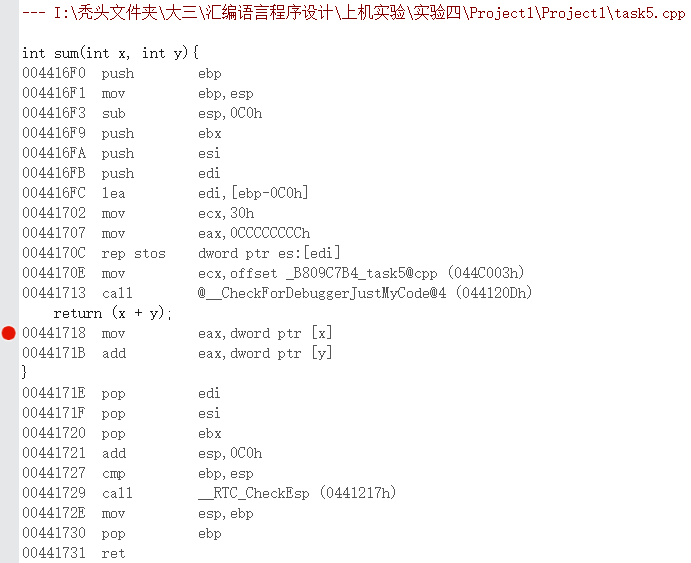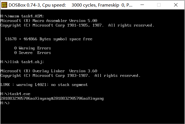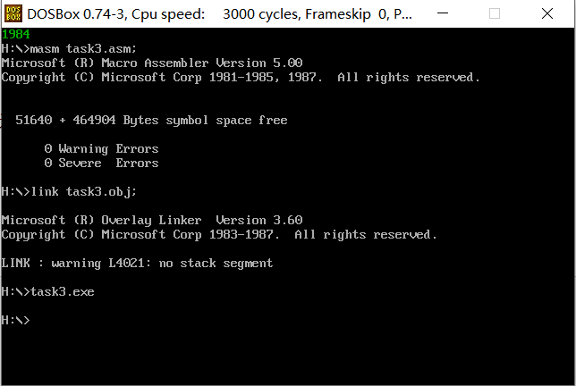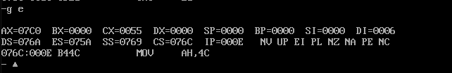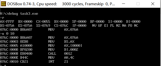 对task3.asm进行汇编、链接,得到可执行程序后,在debug中使用u命令反汇编,使用g命令执行到line15(程序退出之前),使用d命令查看数据段内容,观察是否把转换后的数字字符串'1984'存放在数据段中str标号后面的单元。