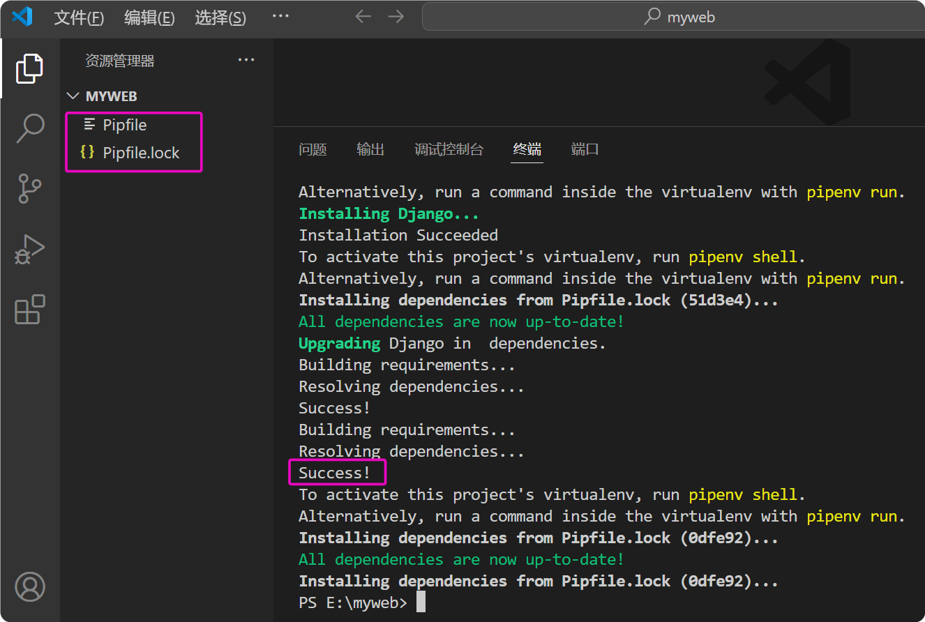 文件夹中会自动添加两个文件:Pipfile and Pipfile.lock。