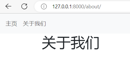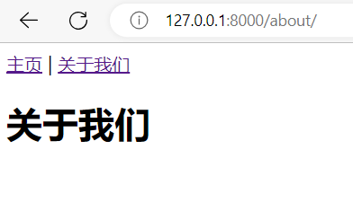 解释:同home.html一样,通过“extends”继承母版(base.html)中的部分内容和结构,同时用自己的内容“<h1>关于我们</h1>”填充从base.html中的空白块(block)。