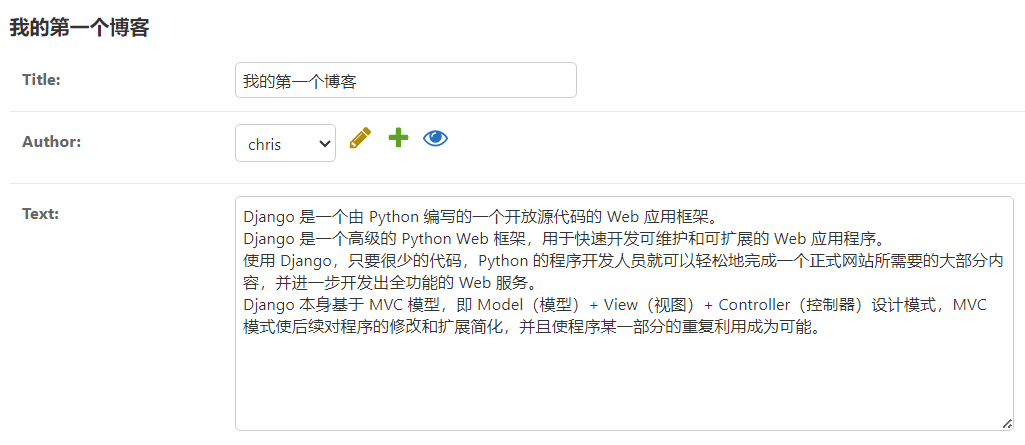 from django.db import models class Post(models.Model): title=models.CharField(max_length=100) #新增字段 author=models.ForeignKey('auth.User',on_delete=models.CASCADE) #新增字段 created_at = models.DateTimeField(auto_now_add=True) #新增字段 text = models.TextField() def __str__(self): return self.title #更新内容