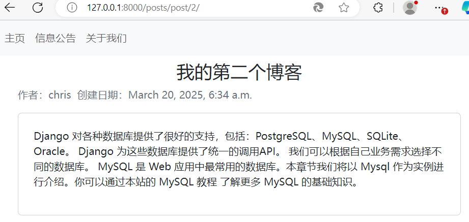 代码解读:视图中引入了DetailView类,并创建了一个用于显示详情页的类PostDetailView,context_object_name中的名字可以自定义,此处我们命名为mypost。