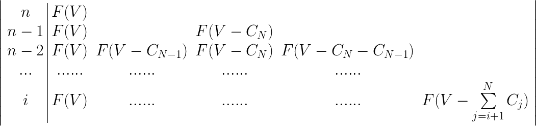 也就是说, 我们只要求$F(V)$的话,就不用管$V-\sum^{N}_{j=i+1}C_j$之后的,因为它们对$F(V)$是一定没有影响的。