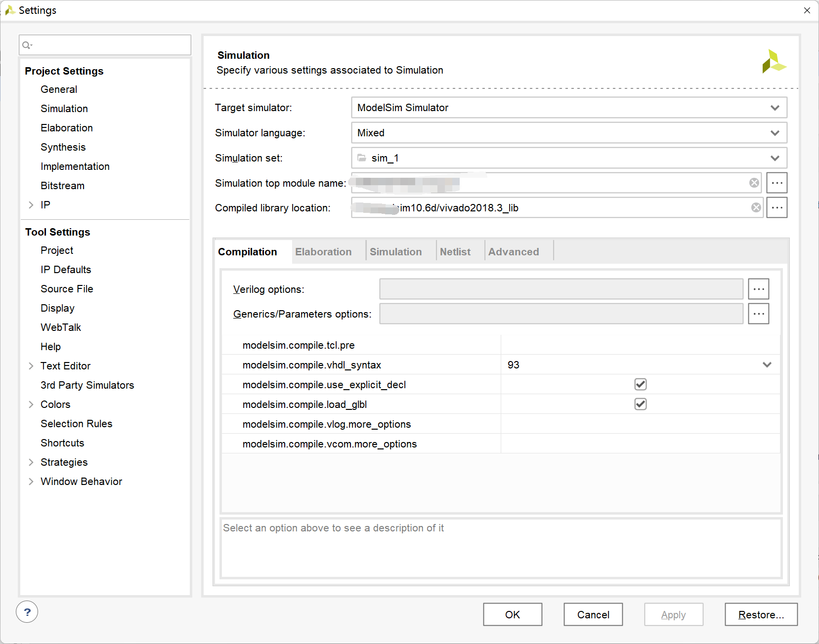 3.Vivado使用Modelsim做仿真软件,如果在更换工程或版本后可能会出现编译后库文件地址错误的情况,这需要手动更改才行。