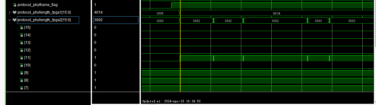 可以看到length_fpga2的bit11莫名其妙翻转,现在直接揭晓答案,因为下载器丢包了,当把测试的特定值改为 0xaa,0x55等高带宽的码字的时候,出错的概率更大(出错时下载器时钟30MHz),更改为10MHz后正常。