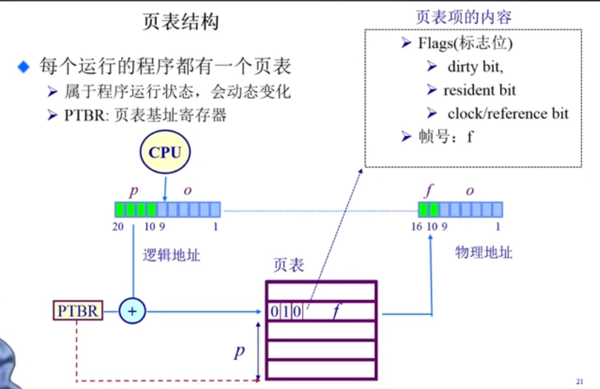 一个程序在运行的时候,这个程序本身的地址(逻辑地址)是连续的空间,将页号作为一个索引查页表,页表存的是以页号为索引的对应的帧号 加上偏移(和页的偏移一致)得到物理地址