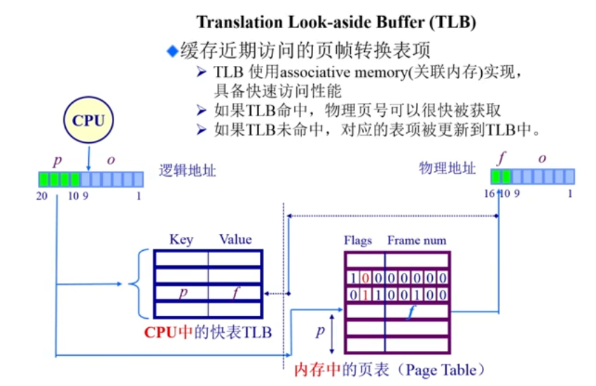 把经常访问的页表项放到TLB中,此时就不需要查页表,当CPU得到一个逻辑地址,首先根据p查TLB,如果TLB存在p,很容易找到f,
