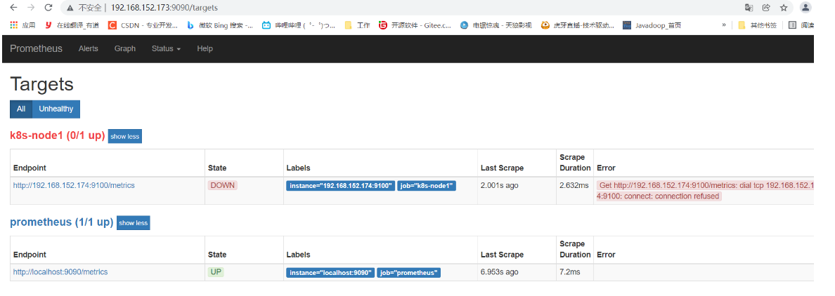 通过如下URL可以打开prometheus的自带监控界面: IP:9090,点击targets 跳转到监控目标,这里展现了两个监控对象。红框的表示部署的prometheus