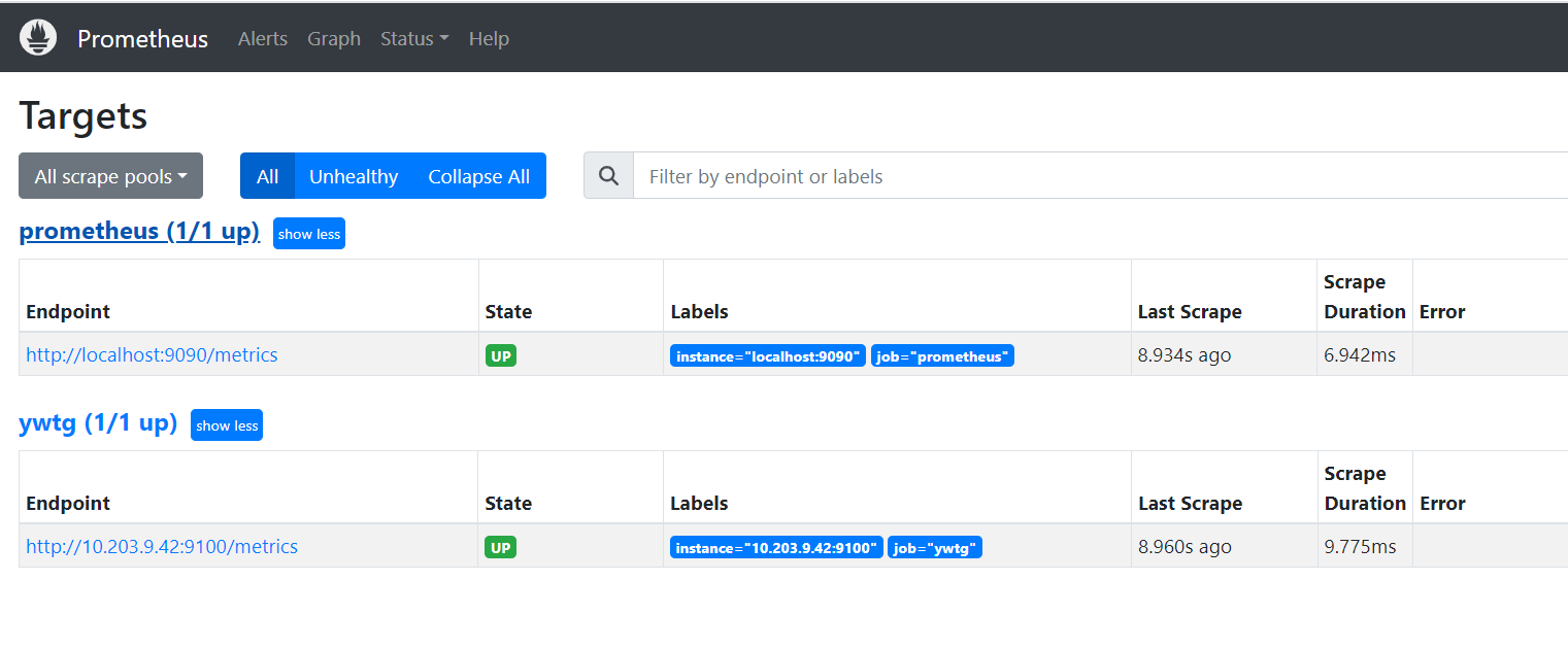 执行后,我们回到prometheus查看监控目标,访问9090端口,可以看到主机也显示为蓝色了