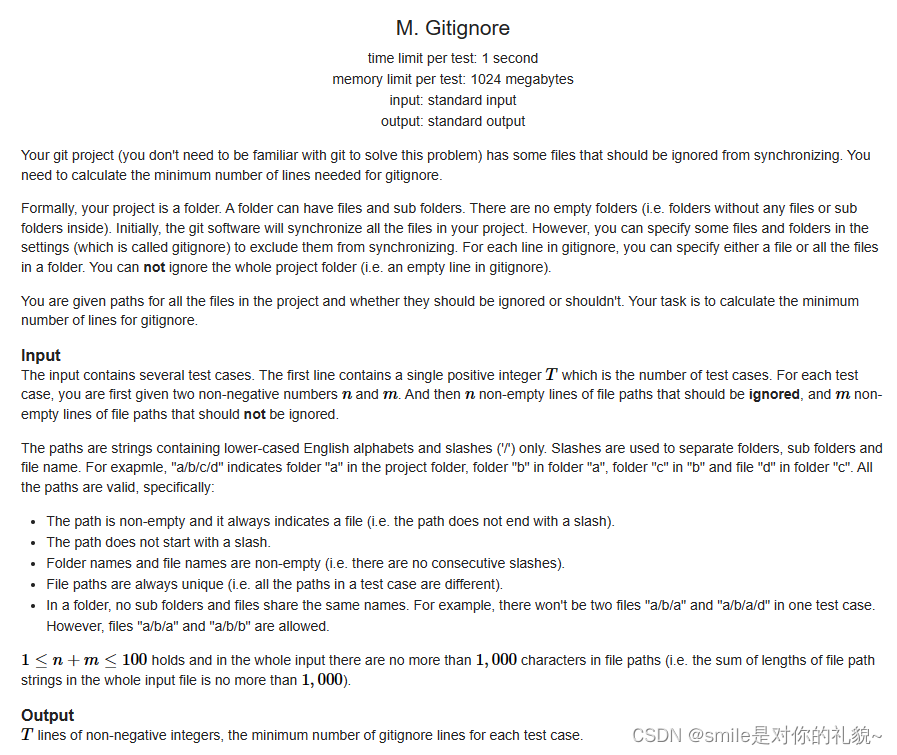 题目大意是说每组样例给你n和m个由‘/’分割的字符串,前n个是需要 ignored的后m个不能被 ignored,问我们最少 ignored几次能完成。就像删文件夹,一个文件夹里面如果全部都要删,那我们直接删一次总文件夹就好,负责就得将需要删的子文件夹一个一个删。理解题意之后就很容易想到递归统计我们需要的处理的次数,而建树的话,我们定义一个节点类建字典树就好。