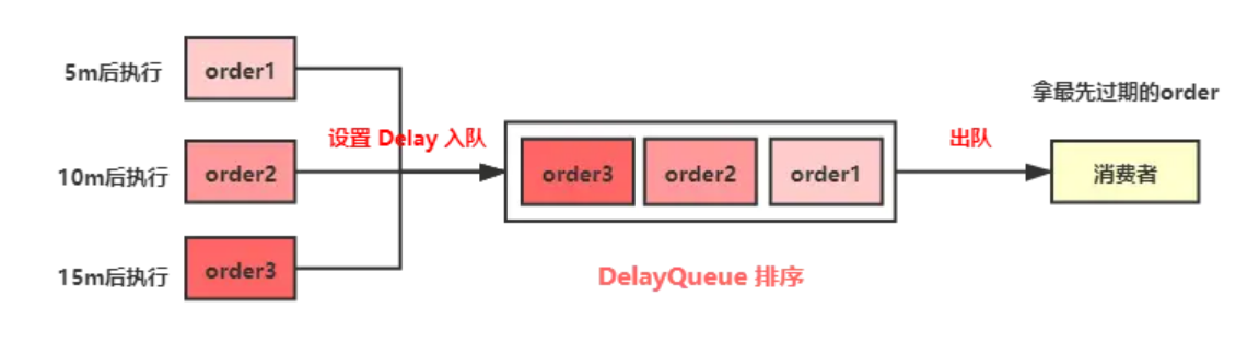 public class DelayQueueDemo { public static void main(String[] args) throws InterruptedException { Order Order1 = new Order("Order1", 5, TimeUnit.SECONDS); Order Order2 = new Order("Order2", 10, TimeUnit.SECONDS); Order Order3 = new Order("Order3", 15, TimeUnit.SECONDS); DelayQueue<Order> delayQueue = new DelayQueue<>(); delayQueue.put(Order1); delayQueue.put(Order2); delayQueue.put(Order3); System.out.println("订单延迟队列开始时间:" + LocalDateTime.now().format(DateTimeFormatter.ofPattern("yyyy-MM-dd HH:mm:ss"))); while (delayQueue.size() != 0) { /** * 取队列头部元素是否过期 */ Order task = delayQueue.poll(); if (task != null) { System.out.format("订单:{%s}被取消, 取消时间:{%s}\n", task.name, LocalDateTime.now().format(DateTimeFormatter.ofPattern("yyyy-MM-dd HH:mm:ss"))); } Thread.sleep(1000); } } }