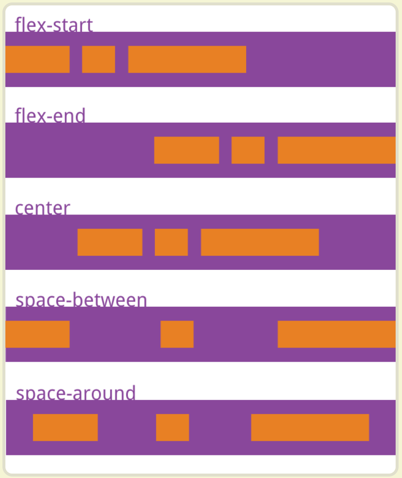 - space-around:每个项目两侧的间隔相等。所以,项目之间的间隔比项目与边框的间隔大一倍。