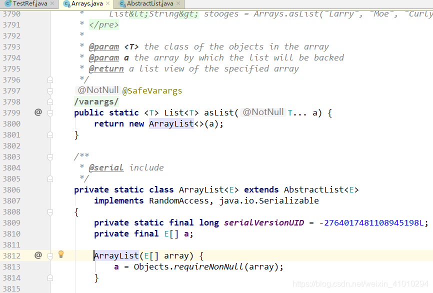 而Arrays.asLsit()点进去,发现是new了一个ArrayList,是一个内部类,继承了AbstractList,如下