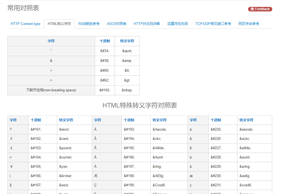 常用对照表: