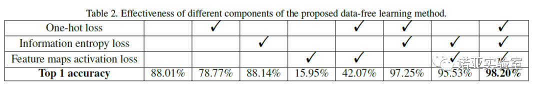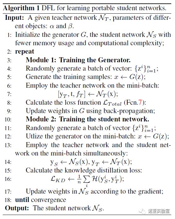 算法1是本论文方法的流程。通过公式(5),我们可以训练一个生成器来生成和原始图片服从相似分布的数据。接着,我们使用生成数据,基于蒸馏算法训练学生网络,从而完成无数据情况下的网络压缩。