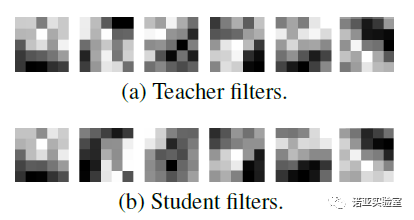 最后,我们对教师和学生得到的卷积核做了可视化,可以发现,我们的方法学到的学生网络和教师网络具有非常相似的结构,证明了本论文方法的有效性。