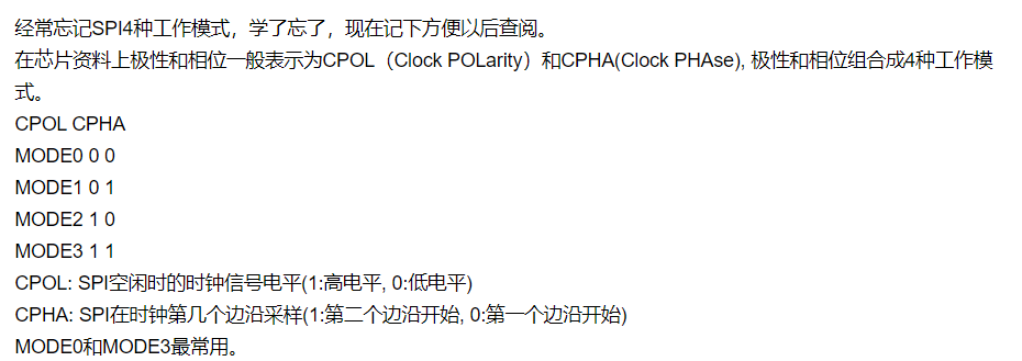 今天同事提出来一个问题 关于SPI工作模式的配置,查了下资料,常用的是模式0和模式3,有的芯片这两个模式都支持,但是同事发过来的芯片资料还就仅支持模式1,所以留下资料给自己提醒
