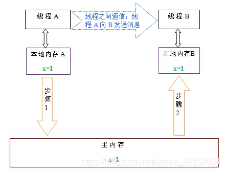 如上图所示,本地内存A和B有主内存中共享变量x的副本。假设初始时,这三个内存中的x值都为0。线程A在执行时,把更新后的x值(假设值为1)临时存放在自己的本地内存A中。当线程A和线程B需要通信时,线程A首先会把自己本地内存中修改后的x值刷新到主内存中,此时主内存中的x值变为了1。随后,线程B到主内存中去读取线程A更新后的x值,此时线程B的本地内存的x值也变为了1。