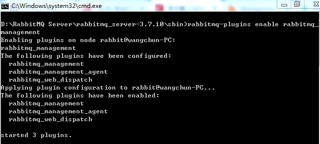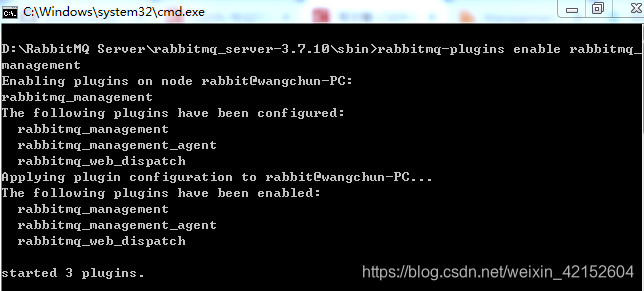 在D:\RabbitMQ Server\rabbitmq_server-3.7.10\sbin这个地址下打开cmd命令行窗口,运行命令