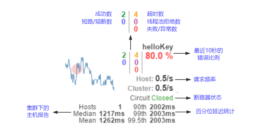 - 实心圆:它有颜色和大小之分,分别代表实例的监控程度和流量大小。如上图所示,它的健康度从绿色、黄色、橙色、红色递减。通过该实心圆的展示,我们就可以在大量的实例中快速的发现故障实例和高压力实例。