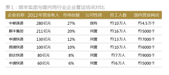 顺丰集团的收入从2010年的112.52亿元快速增长到2012年的210.18亿元,3年时间差不多翻了一番。截至2012年,顺丰集团的经营规模仅次于国有的中邮速递,远超“三通一达”(申通、圆通、中通和韵达)的业务水平,市场占有率达到20%,在我国快递行业的龙头地位得以确立(表1),一个庞大的国际化顺丰商业王国呼之欲出(图2)。