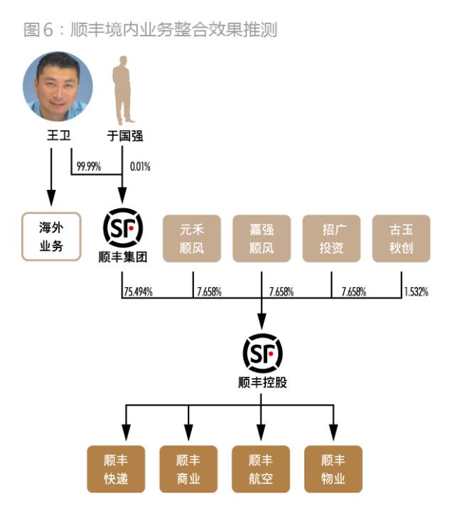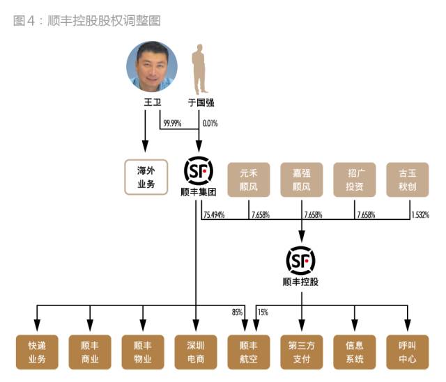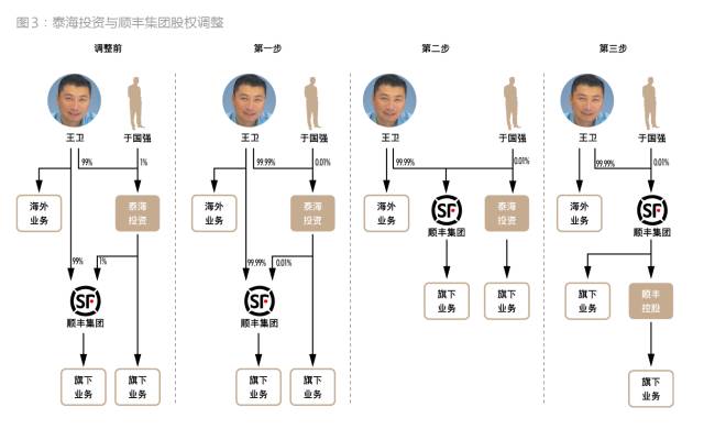 首先,2013年5月9日,王卫分别受让于国强所持泰海投资0.99%股权、受让泰海投资所持顺丰集团0.99%股权。经过调整,股权架构不会发生变化,只是于国强持有泰海投资、泰海投资持有顺丰集团的股权比例都变为0.01%。