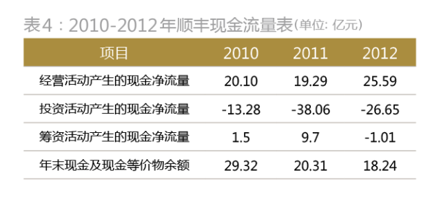 从顺丰的现金流进行分析,在其厚实的快递业务支持下,顺丰的年末现金及现金等价物余额近3年一直在20亿元左右,最高的2010年一度接近30亿元(表4)。并且2010-2012年,顺丰偿还了大量的贷款,3年偿还债务支付的现金流出分别为7.35亿元、7.75亿元和28.48亿元。